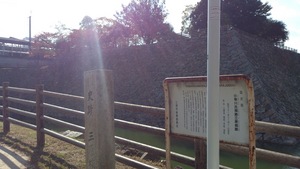 逆光なのでよく写っていませんが、お堀と、石垣です。